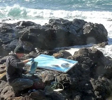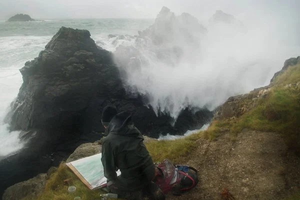 Looking out from an upstairs window I have a narrow view of the sea, so after a quick check every day, I cycle from the house the half mile down the hill, to the waters edge. The daily draw of this journey, is to experience the energy and witness the constantly changing drama the weather and sea conditions offer up. Tides, wind and light direction, swell and weather all influence my decision of where to paint, and in the summertime a territorial Oystercatcher might advise me to move to a better spot!